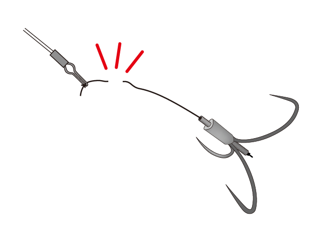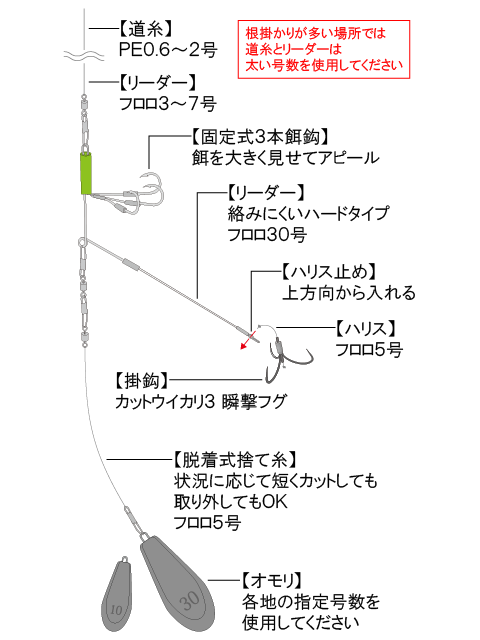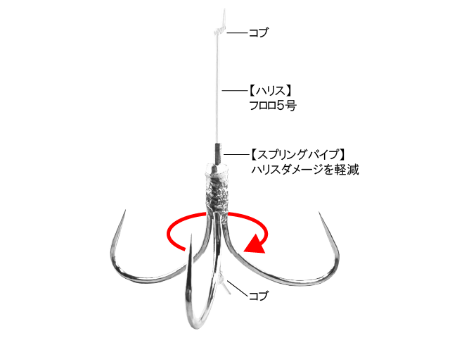 フグの歯に負けない頑丈な固定式3本餌鈎と、